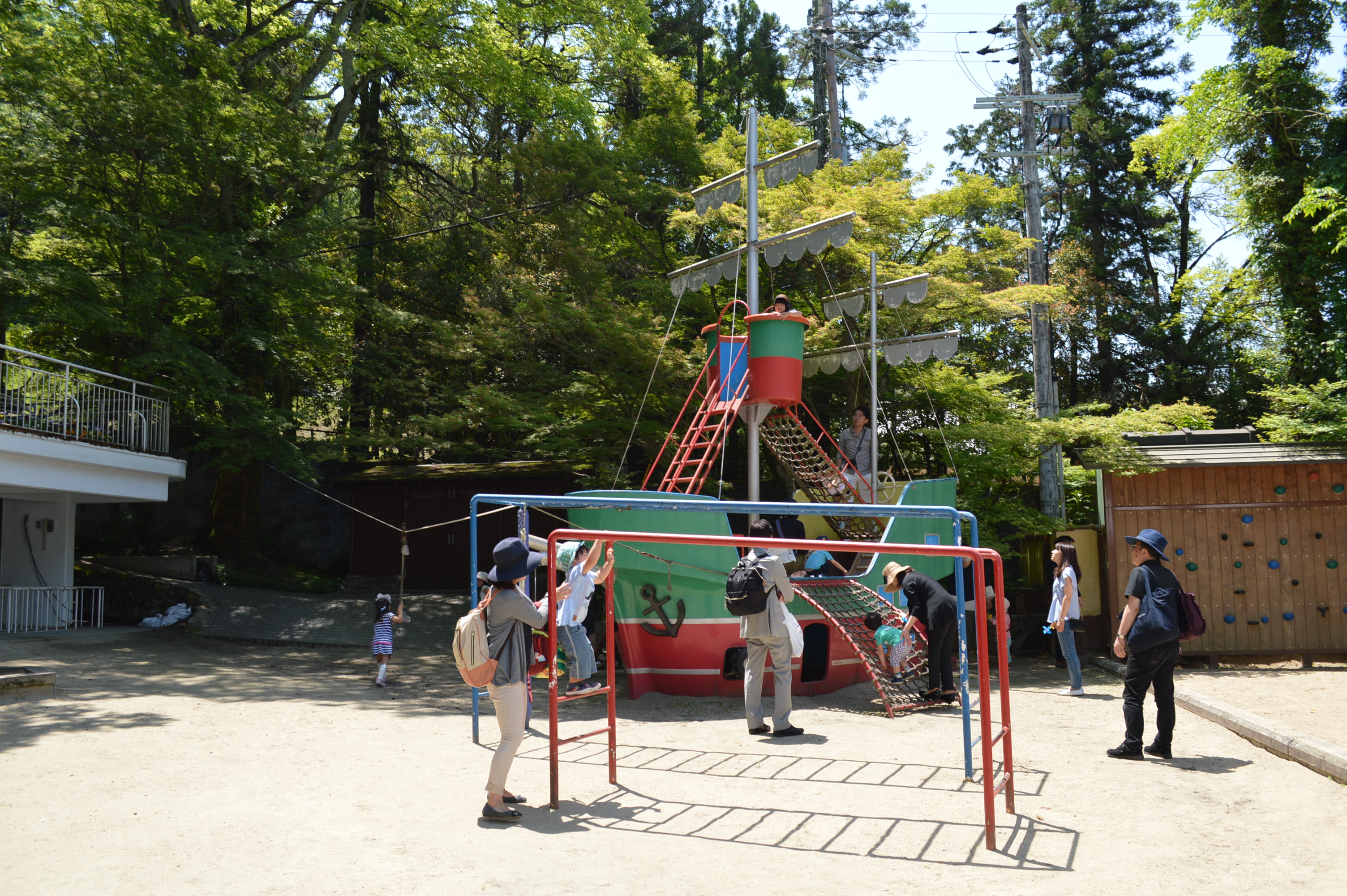 運動場の向こうには砂場やすべり台、ブランコもあります