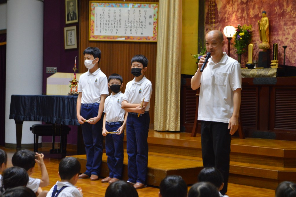 今年の祇園祭で稚児をされる同志社小6年の瀧光翔(たきひかる)君、禿をされるノートルダム学院小6年の高田聡佑君と同志社小5年の石角拓也君が永観堂幼稚園に挨拶に来てくれました。