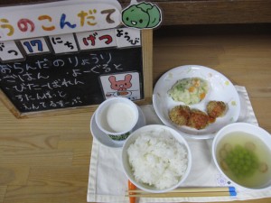 | 5日(月) | ご飯 焼き焼売の生姜あんかけ 白菜の塩昆布和え じゃが芋の味噌汁 レモンクッキー |