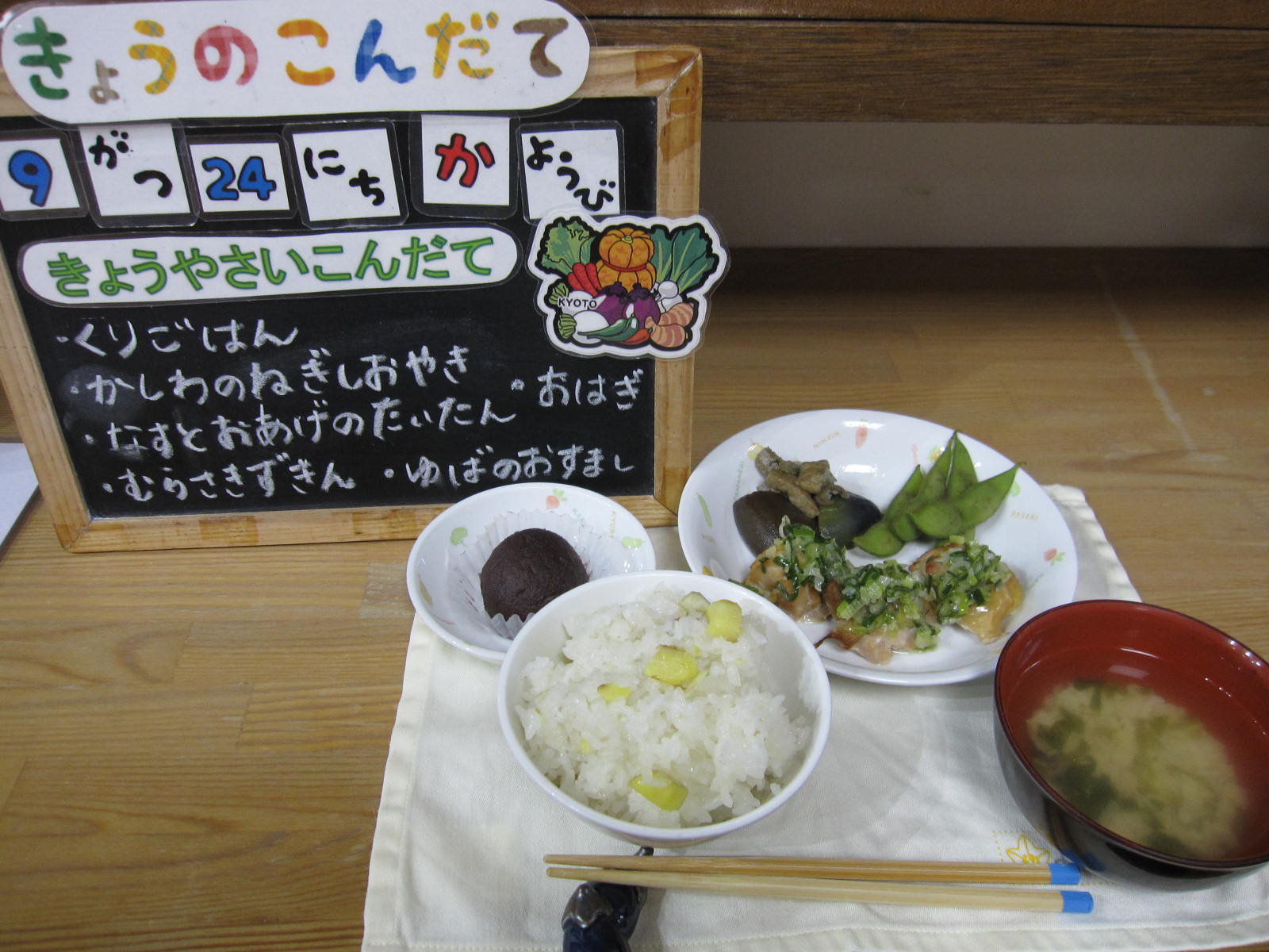 | 17日(木) | <十三夜献立> ご飯 秋鮭の西京焼き 里芋と人参のおかか和え 金時煮豆 えのき茸のおすまし 栗蒸し羊羹 |