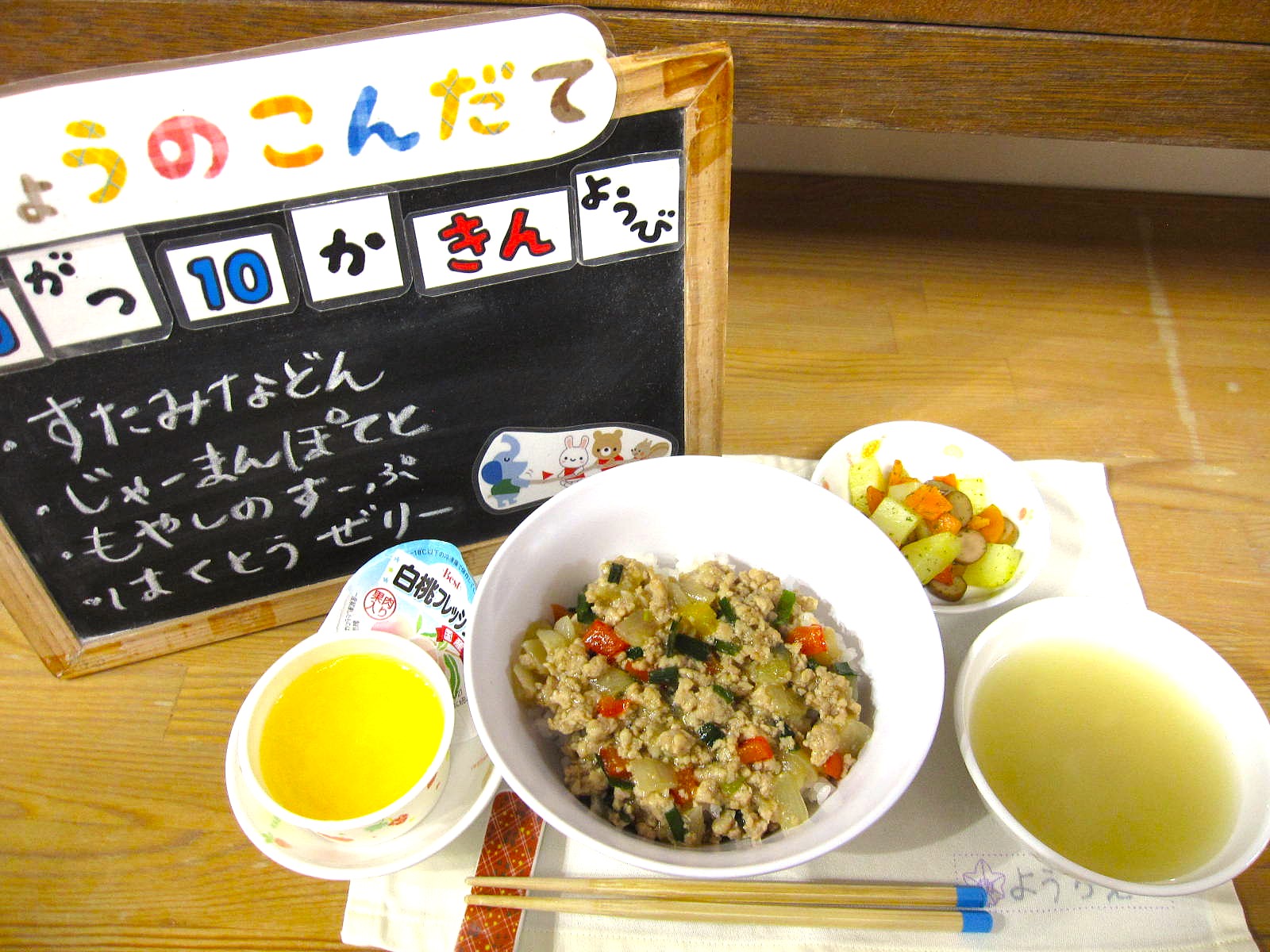 10日。運動会前のお給食はいつもスタミナ丼です。給食室からも応援しています。