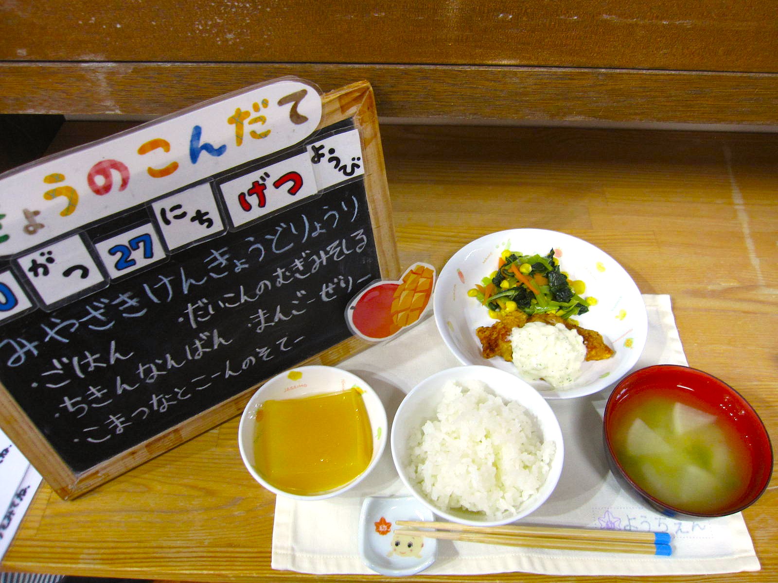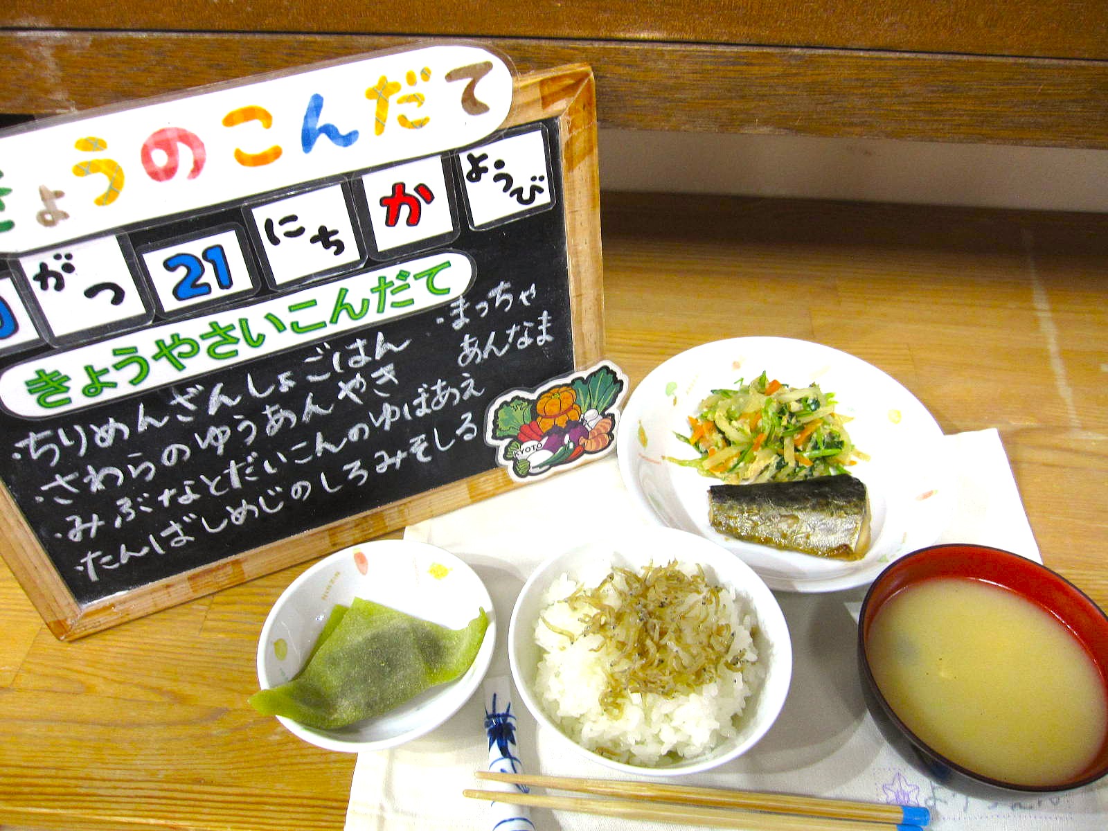 21日。京野菜献立です。写真では見えていませんが、味噌汁に丹波しめじを使用しています。普通のしめじより大きく、歯ごたえもあります。