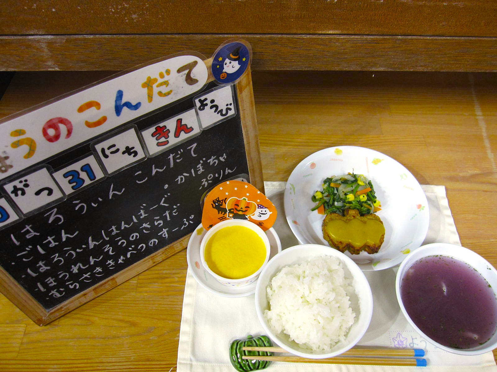 31日。ハロウィン献立です。紫キャベツのスープはいつも驚かれますが、よく食べてくれます。